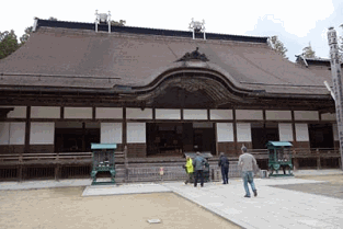 金剛峯寺前でバスを降り、寺を見学する。しっかりと金のかかった荘厳なつくりは、見る人を圧倒する。屋根の上には防火上の水桶とそこへ登る梯子が置かれている。どこまで効果的かは不明だが、予防意識を高めるには良いだろう。中に入ってゆっくり説明を聞きたかったが、今回は止めて、外だけの見学になった。