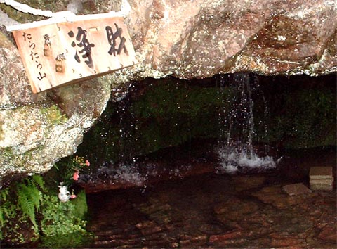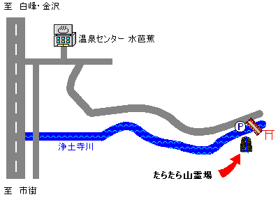 温泉センター水芭蕉から浄土寺川沿いにしばらく行くと、弁白龍大神をまつる「たらたら山霊場」が対岸に見えてきます。 平泉寺の御手洗(みたらい)池から流れ来ると伝わる「白龍の滝の霊水」は、大変まろやかで「名水」の誉れ高く、遠く京阪神からポリタンク持参で汲みに来る人も大勢います。 この周辺は蛍の名所としても有名。