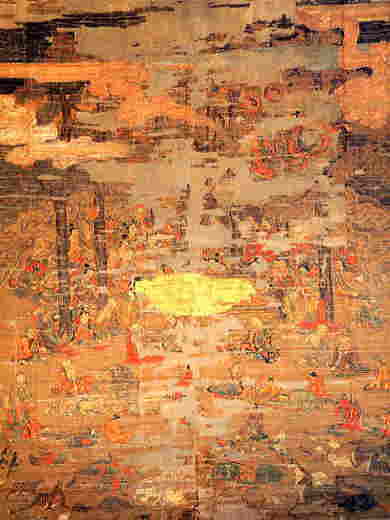 お釈迦様が沙羅双樹の下で横臥し、涅槃に入られる図であります。頭北南面で周囲にはお弟子たちや禽獣らの悲しむ様子が画かれております。函の裏書によりますと、龍泉寺には元々涅槃像図がニ幅あってそのうちの一つは大幅であったが破裂してしまい、もう一つは小幅で蔵されてきました。弘化4年(1847)の春、本多公が新しい涅槃像図を寺に寄進しようとしたので、この旧像図を見せると、その筆致の非凡さに公は驚いてこれを専門家に鑑定させました。その結果兆殿司の真筆と断定したといわれます。涅槃像図には、画かれる形態により概ね大きく二つの形式に分かれますが、この像図は第二形式に属します。全面にわたり剥落が著しいのが残念ですが、南北朝時代の貴重な涅槃像図として武生市の指定文化財になっております。