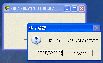 アイコンは"?"、"はい"ボタンと"いいえ"ボタンとし、"はい"ボタンが押された場合のみフォームを閉じることとします。