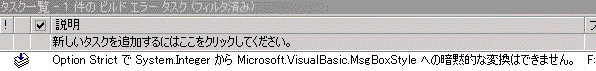 試しに、Form1.vbのコードの先頭に Option Strict On と記述し、型チェックを厳しくしてみると、