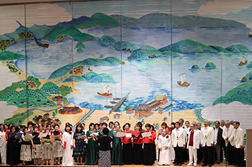 | 能登の合唱を盛んにと始めました。 第一回は令和17年で9団体が出演、その後十数団体で推移。2020年には新型コロナで第16回が延期となり、2024年は継続使用していたホールが罹災し開催不能となりましたが、珠洲市から困難な中でも歌いたい歌って元気になりたいとの声があり、避難所となっていた施設の多目的ホールが使えるようになったことで、思い切って開催しました。それでせっかくの機会なので、以前に制作してありました。江戸時代に七尾の上空から見た七尾町、七尾湾、能登島、能登半島の大ホリゾント幕を震災復興のシンボルとして掲げました。5団体の出演となりました。ありがたかったです。今年は9月20日です。 | ||