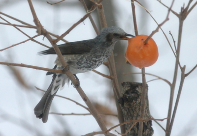 柿にはヒヨドリもやって来てくれた。 でも、ヒヨドリが来ると柿がすぐになくなってしまう。 13日は1羽のみ。 14日には2羽やって来た。 だんだん増えるのか? 冬のヒヨドリは白っぽい個体が多いように思う。 1月13日撮影 |