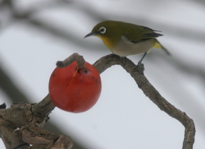 向かいの木に柿を刺してみたら、さっそくメジロが来てくれた。 冬の自然観察の森では個体数が少なくなる種。 1月6日撮影 |