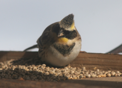 エサ台にミヤマホオジロの♂2羽が来るようになった。 まだ少し落ち着かない様子だが、しきりに粟をついばんでいた。 1月13日撮影 |