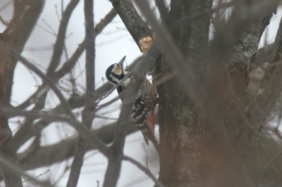 | 少し遠いところでオオアカゲラ発見!枯死した枝を突付いて採食していた。 PAGE3の個体は頭部が赤くてオス。 こちらは頭部に赤がないのでメス。 1月6日撮影 |