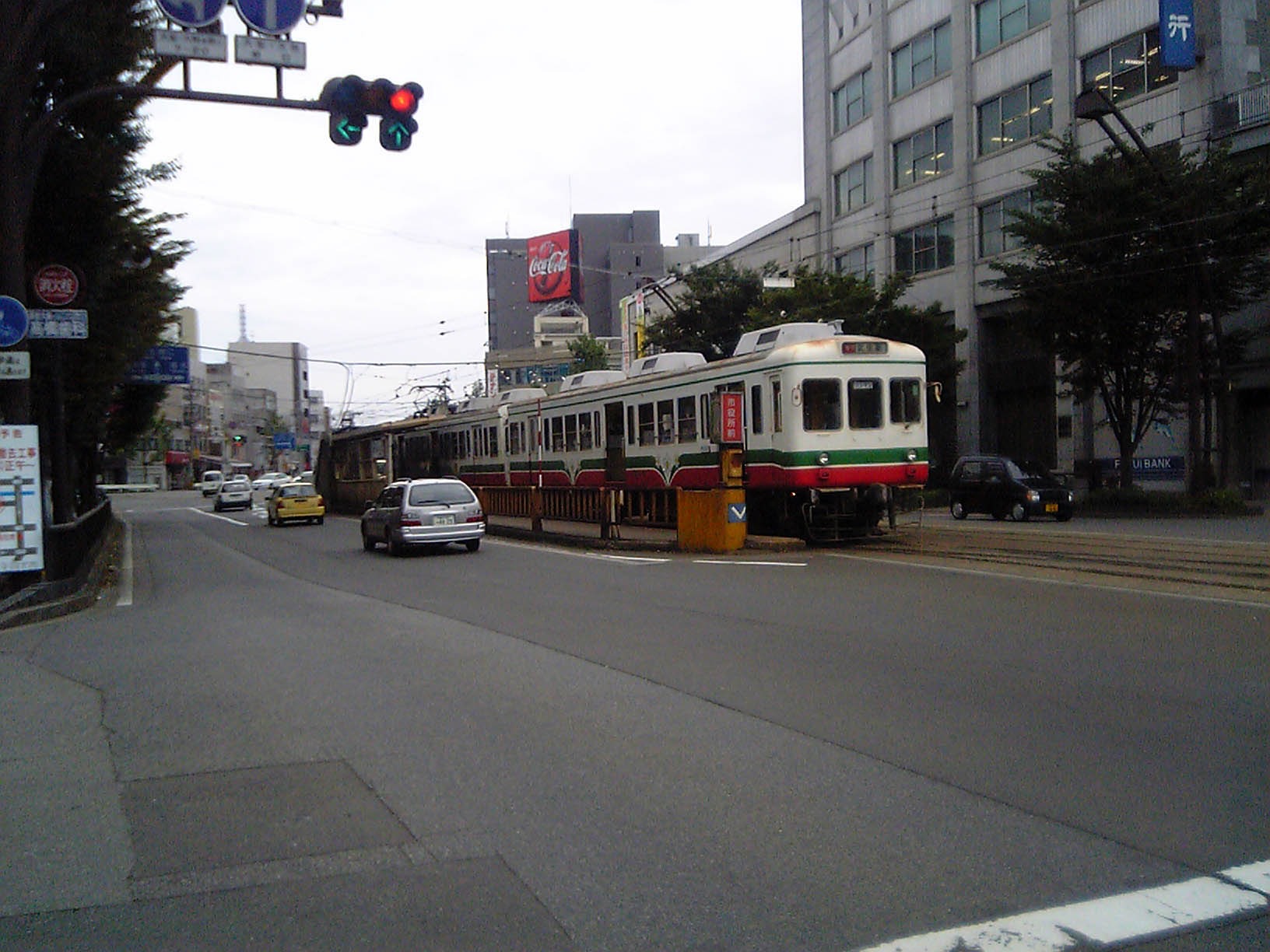 それで、今日から携帯のデジカメで撮った写真を折りある毎に貼ってみようと思います。今回は「自分の携帯がどの位の写真を撮れるのか?」を試す意味合いも込めて (^^; こんな写真を貼ってみました。献血の帰りに福井駅前の様子を写したのですが、なんか変だと思いませんか。福井の駅前にはいわゆる路面電車が通っているのですが、これが普通の電車がそのまま路面に乗り入れているんですよね。かなり以前に、福井にコンサートに来たアルフィーが一目見て驚いて、ラジオ番組でネタにしていましたが(笑)。