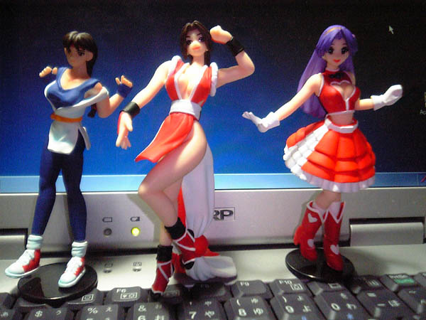 昨日の日誌に書いた“KOFコレクション・ギャルズ編PartI”ですが、今日同じゲーセンに行ったら無くなっていました。 (^^; 恐らく売り切れれたものと思われます。KOFってそんなに人気ゲームでしたっけ?(笑)。という事で、ひとまず昨日買った3人の画像を公開。 それにしても200円のガチャ^2って、なんでこんなにクオリティ高いですか? (^^; なんか表に見えていない○○○oーのしわとかリボンとか膨らみとか(爆)。舞が台座なしで自立してるのなんか、かなり呆れるんですけど。取りあえず置いてあるお店には少なくとも2件ほど心当たりがあるので、次の休みにでも行ってみます。