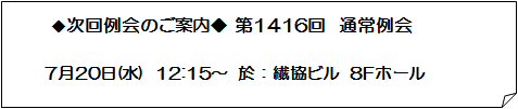 | 7/6 | (水) | 会員委員会(入会について) | 出席予定 | L.山崎幸雄 L.杉田宗雄 L.安部 悟 L.中村 智 L.井上喜一郎 L.村田欣弥 L.浅田利博 L.野坂鐵郎 L.山下重男 L.文珠四郎博 L.木内幹男 |