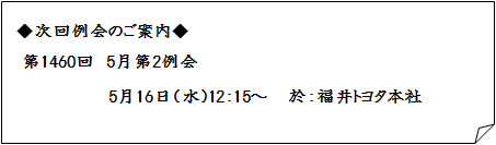 | 第1458回例会 平成30年4月18日 於:福井県立大学 | |||||||||||