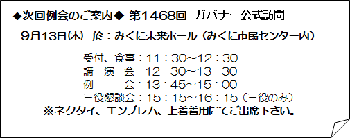 | I. | 9月誕生会員紹介 | 出席委員長 | L. | 塚谷浩一 | |||||||