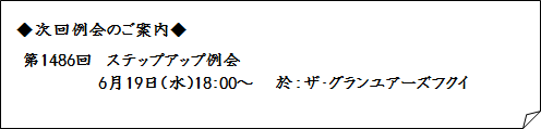 | 6/12 | (水) | ステップアップ例会について | 出席予定 | L.松浦康圭 L.福島 実 L.中村和裕 L.北出慎吾 L.牧田政彦 L.野澤知永 L.村田欣弥 |