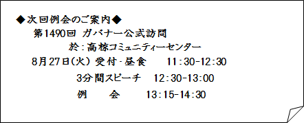 | I. | 8月誕生会員紹介 | 出席委員長 | L. | 竹内邦夫 | |||||||