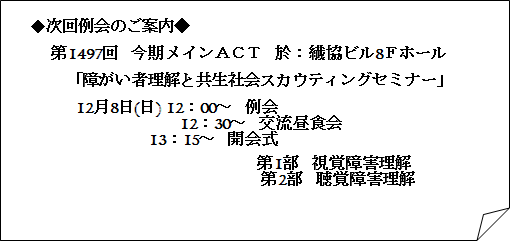 | 11/30 | (土) | 第2回ガバナー諮問委員会 会長幹事会 |