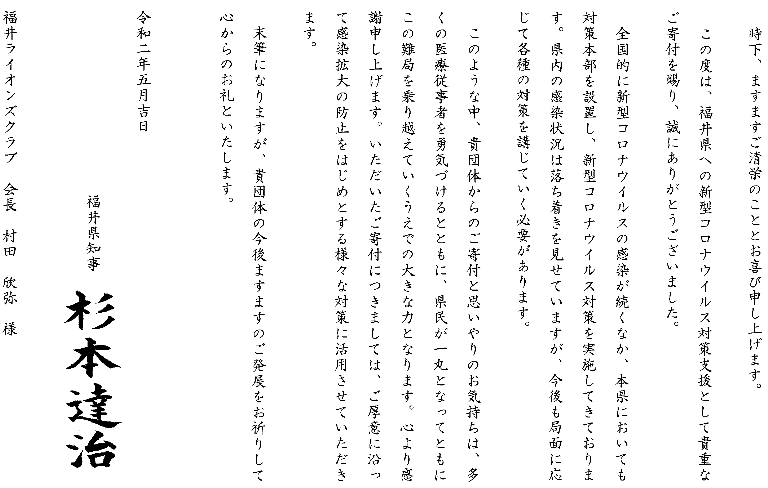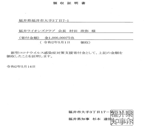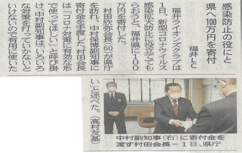 | 5/1 | (金) | 福井県へ新型コロナウィルス対策支援 として100万円を寄付 |