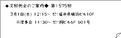 | 3/7 | (火) | 指名委員会 | 出席予定 | 歴代会長、現・次期三役、第一・第二副会長 | 11:00〜 | 於:グランユアーズフクイ 4F茜の間 |