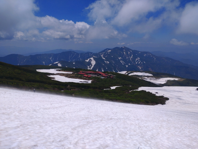 御前ヶ峰山頂直下から弥陀ヶ原まで、水屋尻雪渓がつながっていました。久しぶりに見た景色でした。室堂から千蛇ヶ池の巻道も大部分雪渓の上を歩きます。ガスがかかっていたら迷いそうです。
