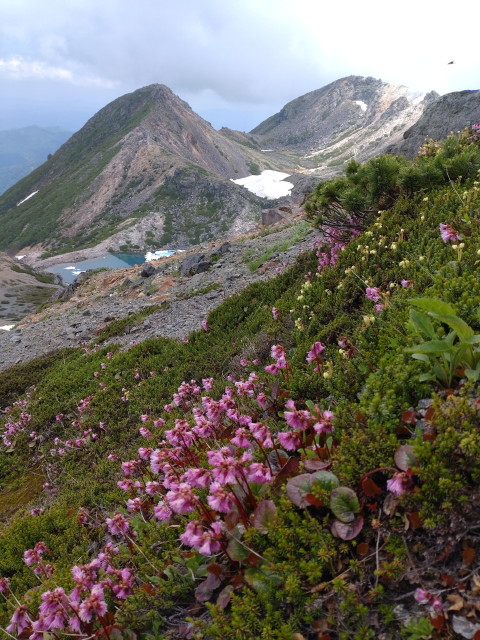 お花の方は、観光新道 殿ヶ池避難小屋より上部で、サンカヨウ、キヌガサソウ、ミヤマキンポウゲ、ミヤマキンバイ、コバイケイソウ、ハクサンチドリが咲いていました。大汝峰周辺では、コイワカガミ、イワウメ、イワツメクサ、チングルマ、アオノツガザクラ、ツガザクラ、ミヤマダイコンソウが咲いていました。お池めぐりコース付近では、ツガザクラ、イワヒゲが咲いていました。「十二曲がり」から黒ボコ岩にかけて、リュウキンカが大群落をつくっていました。砂防新道の別当谷覗き上部で、センジュガンピ、サンカヨウが群落をつくっていました。