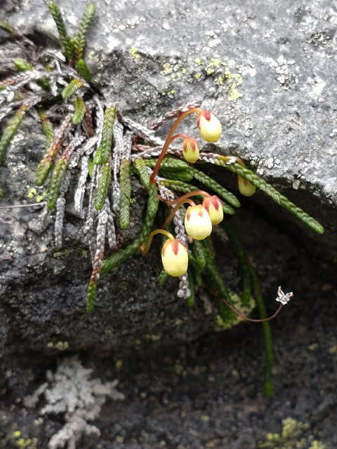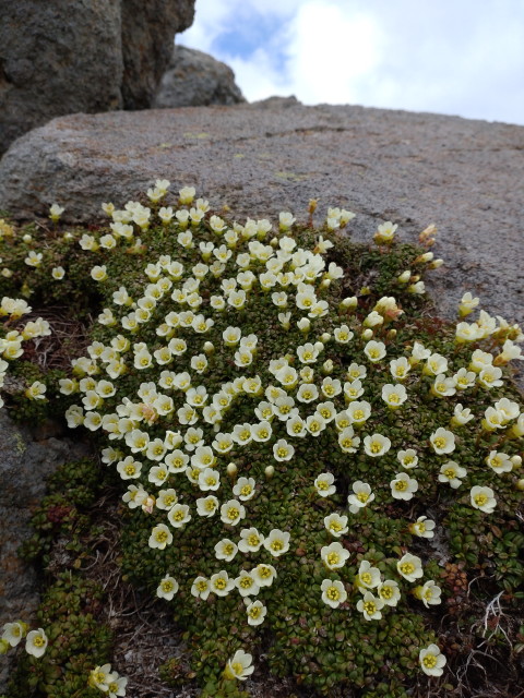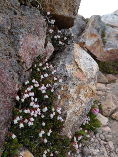 今回、イワヒゲの花を初めてみました。うろこ状の葉の隙間から細い茎の先に直径3㎜位の小さな白い花を付けていました。ツガザクラも同じ場所に咲いていました。