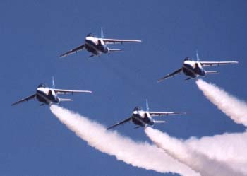 午後からは、いよいよブルーインパルスの登場です。わくわくしながらランウェイのエンドを見つめているとなんとF-2の姿が!。たしか、F-2はブルーの後で飛ぶプログラムだったのに、と思っていたらブルーもタキシングしてきました。結局先にF-2がテイクオフし遥か彼方へ、その後ブルーがあがってショーが始まりました。普段まったく飛行機なんて興味無いようなファミリーの方々もこの時だけは目が輝きます。そんな姿を見ると、私の趣味もみんなに理解されているよな気がして(大きな勘違い)うれしくなります。