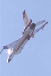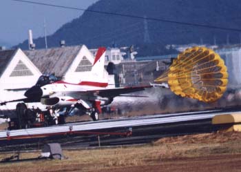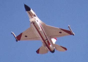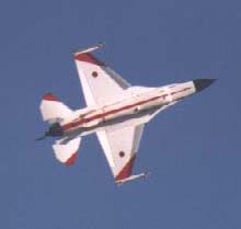 ブルーのショーも終わりいよいよF-2の飛行試験です。機体は単座の1号機(#501)。3回ほどランウェイ上をパスしていきました。初めて見た印象は、F-16ベースだけあって、やっぱり小さい機体ってかんじでした。増槽もつけてなかったので、特にそう感じたのかも。それでも、やっと飛ぶ姿を見れて、感動・感動でした。来年からはこの機種が当たり前のように三沢の空を飛ぶんですねぇ。ちょっと信じられません。