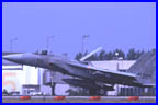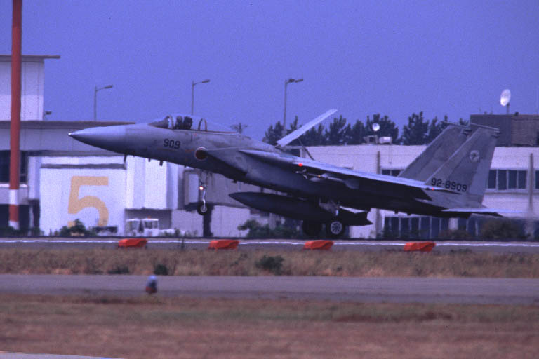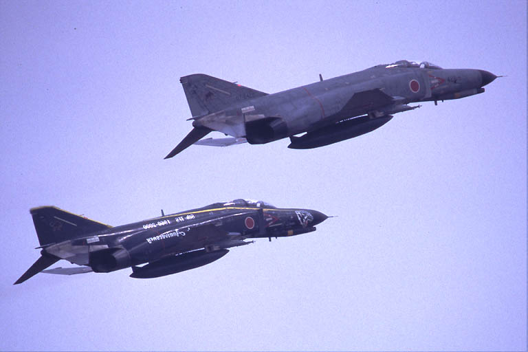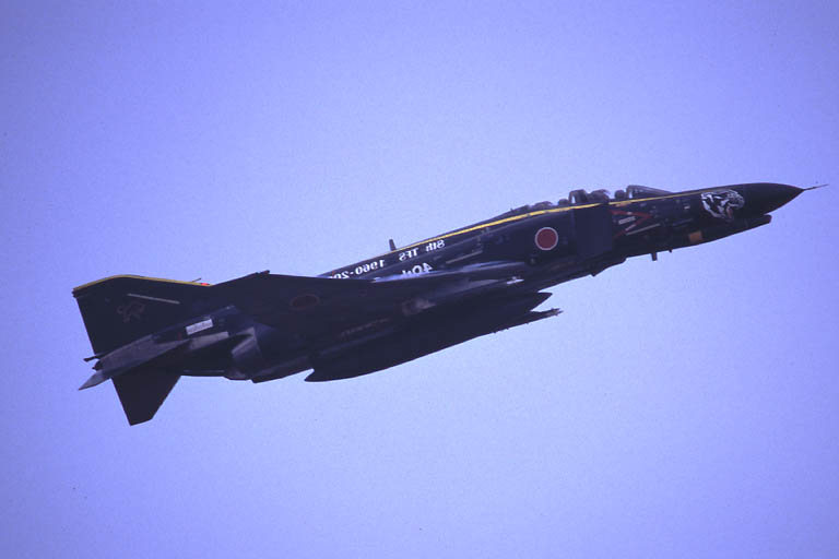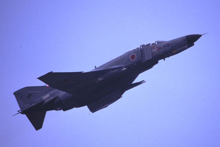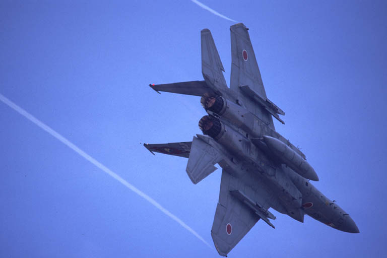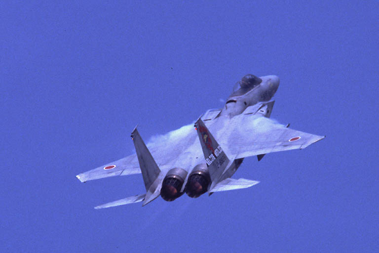 T-1の前あたりに陣取って、とりあえずめぼしい地上展示機の撮影と売店まわり。そうしているうちに303の機動飛行がはじまり、カメラを構えるが、なぜか露出があがらない。テレコン外して、シャッター速度を1/60に落としてもアンダー警告。なぜだぁ!とパニック状態に陥る。冷静にカメラを観察すると、なぜかフィルム感度設定がISO6になっていました。誰だぁ、こんなとこ触ったやつは!って僕しかいないんですけどね。それでも撮ってみた数枚のポジには、心霊写真のような影の薄いイーグルが写っていました。