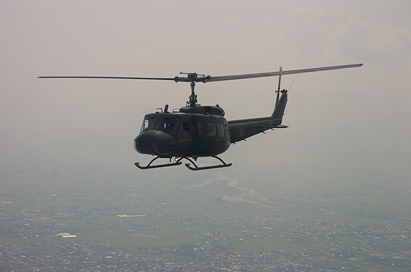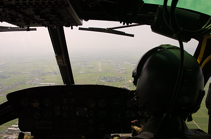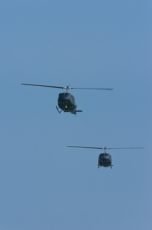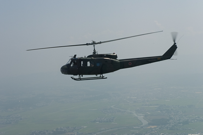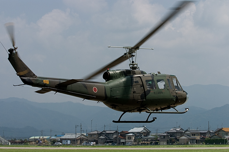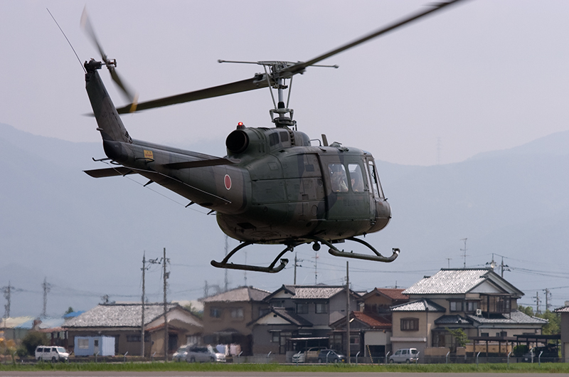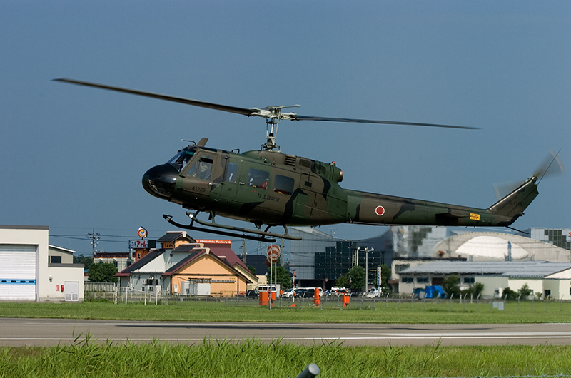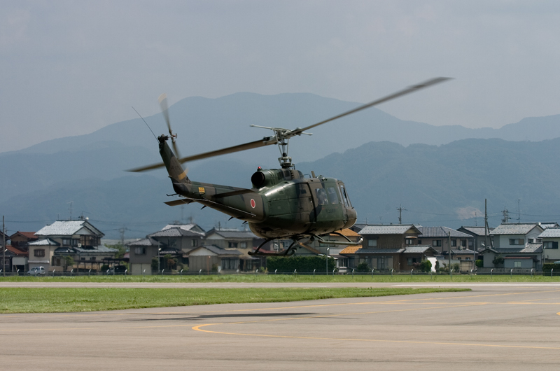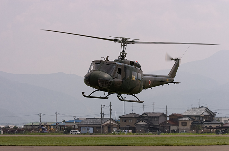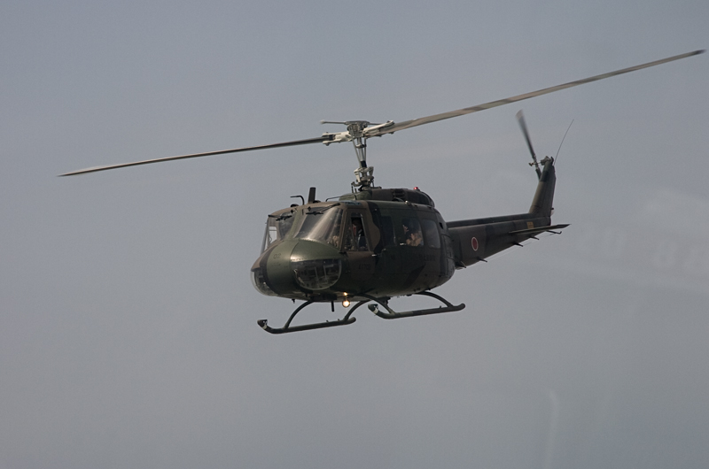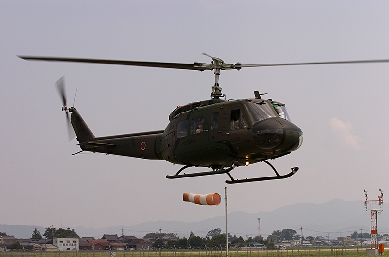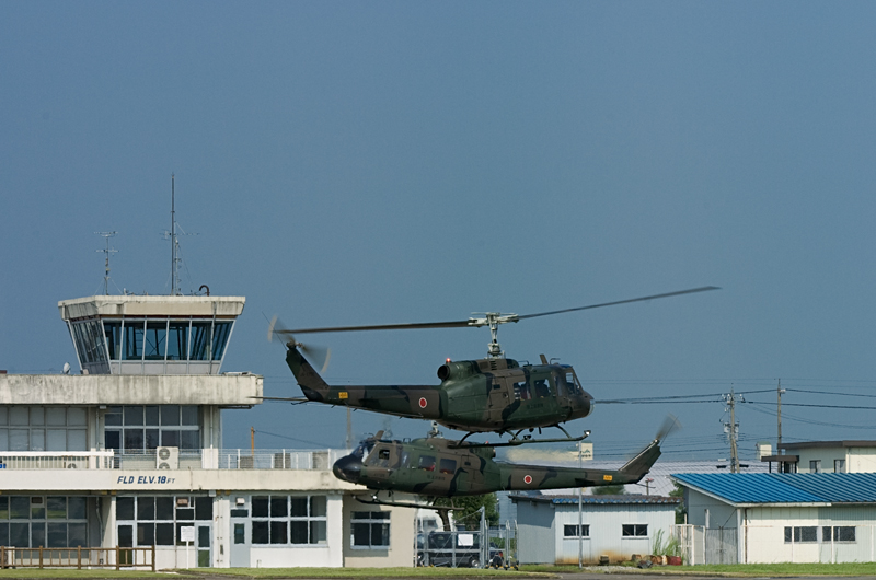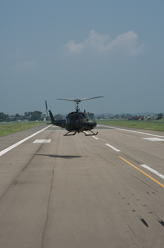 やはり乗せてもらう機体のアライバルは撮らないとと思い、集合時間の前に外から撮影。いつもUH−1の体験搭乗は2機で飛来しますが、2機がからむシーンは何度撮ってもドキドキします。