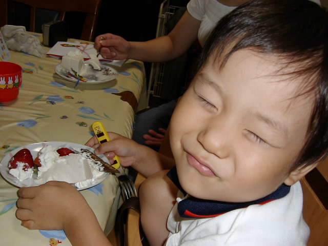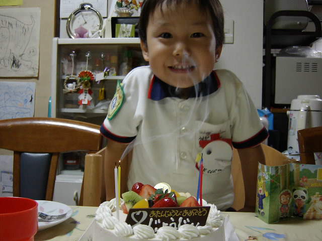 8月 4回目のたんじょうび。去年と比べて大きくなったかなあ。ケーキを食べて、しあわせ〜!