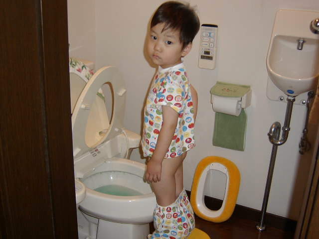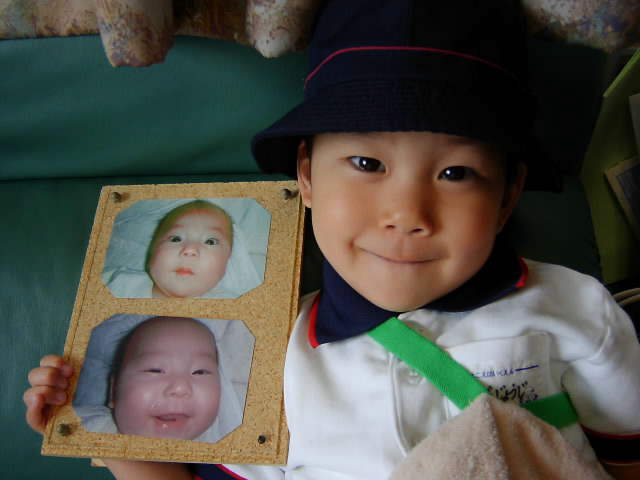 5月 おしっこもひとりで行けるようになりました。右、赤ちゃんのころの自分の写真と。