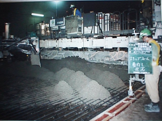 下部にあるスクリューで端部まで送り、敷均し、締め固めを行い生コンを最良の状態で成型していきます。