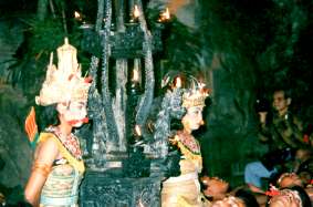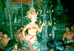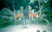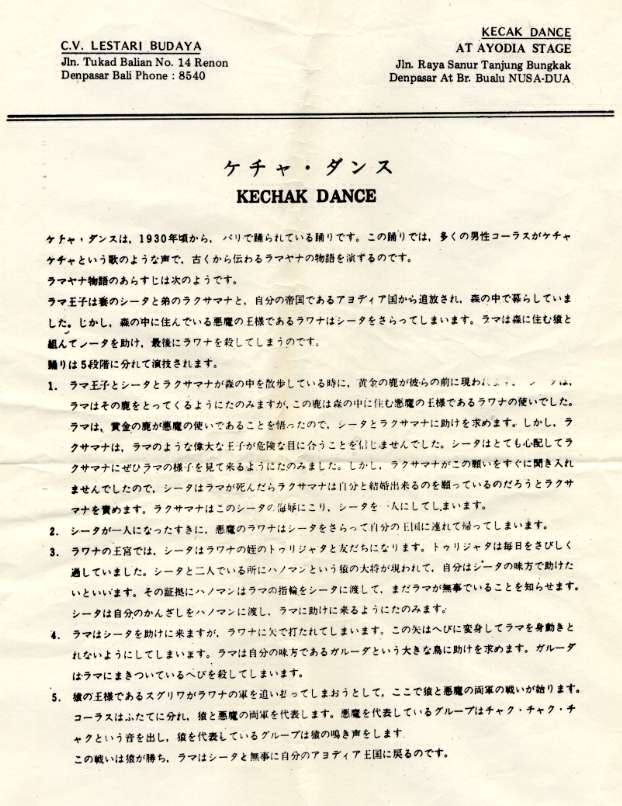 夕方はケチャダンスを見に出かける.妻の友人はバリ旅行で,とにかく各種のダンスを絶賛していた.(その御主人はポロブド−ルを絶賛していた.)車はテンパサ−ル近くの村へむかっているようだ.村の路地を入っていくと泥道に私たち同様の観光客を送ってきたような車がたくさんいる.何か,日本のふた昔ほど前の,村にある電車の駅前の農協の倉庫の前のような所だった.うっそうとした森の方に”こっちだ”と案内され,ケチャダンスの会場へ入って行く.森の中に石をひきつめたステ−ジがあり,その周りを囲むように3方に座席がある.座席といっても,やはり石段のようなもので,10cmくらいの階段状になっている.ステ−ジも座席もこけがはえそうな古い造りだ.ステ−ジの中央の後には例の空を割るような割れ門があり,その後ろにも藁吹きの屋根とかが見える.ステ−ジ中央には,ろうそくをたてるらしい石柱が建っている.50人もくれば満席だろう.ところどころにかとりせんこうがおいてあり,煙りをあげている.観客は,白人系が多い.この自然の舞台効果はかなりのものだ.観察しているだけでちょっとした興奮状態になる.ステ−ジの石柱にたくさんのろうそくが灯されると,もう気持ちはステ−ジに吸込まれている.”ひゅ−っ”と声を出しながら,数十人の歌い手(踊り手)がステ−ジへ出てくる.そして,全員石柱の方をむき,円形(八角形)で4列くらいで小学生座りで座る.ひとりの合図で例の”ケチャケチャケチャ・・・・”のスタ−トだ.一定のリズムかと思えば,急にテンポと言葉(言葉なのかな?)を変えてつずく.リズムにあわせ,歌い手が体をゆする.しばらくすると歌がソロとなり,2人の女性の踊り手が登場,それから,サルのような踊り手,ガル−ダが登場.スト−リ−に従って展開していく.おおぜいの歌い手の輪の中で登場人物の踊り手が踊る,という感じだ.ただし,さるは,後の木に登っているところから登場した.そのころは森のなかはすっかり暗闇となり,ろうそくの光のなかでダンス,ダンスというより,オペラの一種が続いていく.言葉のわからない私たちにも話の展開がわかってくる.森の中の神秘的なドラマに引き込まれ,クライマックスの頃には,夜もすっかり暮れていた.ボウッとした気分で森を出ると村の道は観光客を送迎する車でごったがえしていた.クラクションをならしながらすれちがう車たちに現実にもどされた.