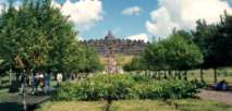 車はどんどん山のなかへ入っていく.途中,バスタ−ミナルらしきものがある町が1ケ所在った他は,どんどん奥に入っていくようだ.道はだいたいいいのだが,道の両側から畑がなくなるころ,工事中のようになった.ポロブド−ルの少し手前で渡った橋から見えた光景は,河の両側はジャングルのように見えて,印象に残っている.そして,しばらく森の中の道を走ると,森を切り開いた公園のような所に出る.駐車場で車を降り公園の入り口へ行くと,門から真っ直ぐ遊歩道のような歩道があり,正面にポロブド−ルの大ピラミッド?がある.両側かなりの広さが芝生の公園になっており,広々としている.ガイド女史に説明されながら,遥か向こうの遺跡まで歩くような格好になる.うっそうとしたジャングルの中で発見されたと読んでいたが,日本風にいうと,”ポロブド−ル遺跡歴史記念公園”といったところか.広々とした公園の中なので,意外に小さく見える.