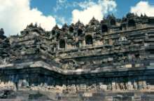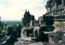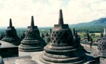 しかし,真近にせまるとかなりのものだ.遠くからは緩やかにみえた石段は意外に急で,見上げるような感じだ.真下に立つと,見上げるばかりだ.正方形を上に向かってだんだん小さくしながら積み重ねていくような形をしている.意外と小さな石で築かれている.各層の回廊は,塔や仏像で装飾され,(ソウバ塔のようなものが乱立している.また,各層に登る階段は,石門をくぐって登る様な形になっている.)壁には細かい彫刻がされている.上の方の階は,回廊も広く,石のド−ム(かご)のなかに仏像が入っているようなものが多数立っている.1体だけ仏像がむき出しになっているのはポロブド−ル開発の反対運動によるものだという.遺跡の頂上は,ド−ム状になっており,先端には避雷針だろう.周囲(というより地平線)を見回すとずっと密林(ジャングル)だった.青い空の下に深い緑色がずっと広がっていた.