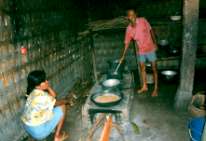 ポロブド−ルの帰路は,まず,近くの農家での黒砂糖を作る様子を見せてもらった.車を降り,密林(私たちにはそう見えた.)の中の小道を行くと,竹の皮を編んだような壁の家の前に出た.いかにも農家という感じの家の一番手前の部屋に入った.そこは,いわゆる”作業場”といったところで,土間だけの部屋だ.手前にかまどが3つあり,奥にテ−ブルがある.本来ならば農作業の道具や農産物が無雑作に置かれている部屋だと思うのだが.意外とこざっぱりとしたおじさんがかまどに乗せられた鍋の茶色の液体を混ぜている.子供のとき母が作ったニンニクのどろどろに溶かしたものを思いだした.ガイド女史の説明ではヤシ(だったと思う)の果汁を煮詰めて黒砂糖にするとの事.机の上のビンにあったでき上がりを少しかじったが,やや,しつこいほどの甘さだった.