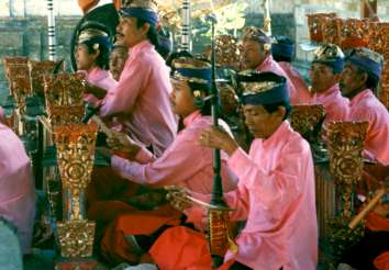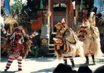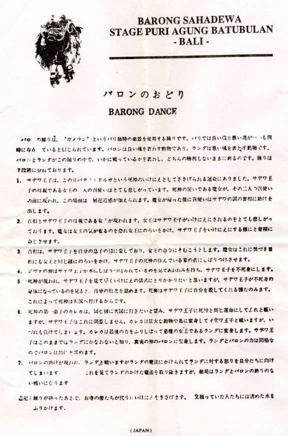 また,晴天の一日.これは,正式なオプショナルツア−ではないが,バロンダンスを見に連れて行ってもらう.あのガイド氏は,これがなかったら休みだったのかな?何度か通って見覚えのある道だから,テンパサ−ル近くまでいったのだろう.ある村の田園のなかに,竹で作ったようなスタンドが見えてくる.中に入ると,白人を中心とした観光客がすでに200-300人ばかり座っている.ほぼ満員だが,日本人は,数えるばかりだ.スタンドは1方向で,前には,ケチャダンスのステ−ジと同じような,割れ門と,右手に,10数人の演奏が,すでに音合せをしている.ガラメンといわれる楽器らしいが,独特の音の重ねあわせとスタンドの屋根でだろうか,音が反響してちょっとした世界を作っている.そういえば,中国の杭州でも同じような音を聞いた.音楽に引き込まれていると,前触れもなく,バロンダンスが始った.ダンスは,獅子舞のようなガル−ダと,王子の物語.昼間なのでケチャダンスの時のような神秘的なものや,エネルギ−は感じないが,バロンダンスは物語的な面白さを感じた.